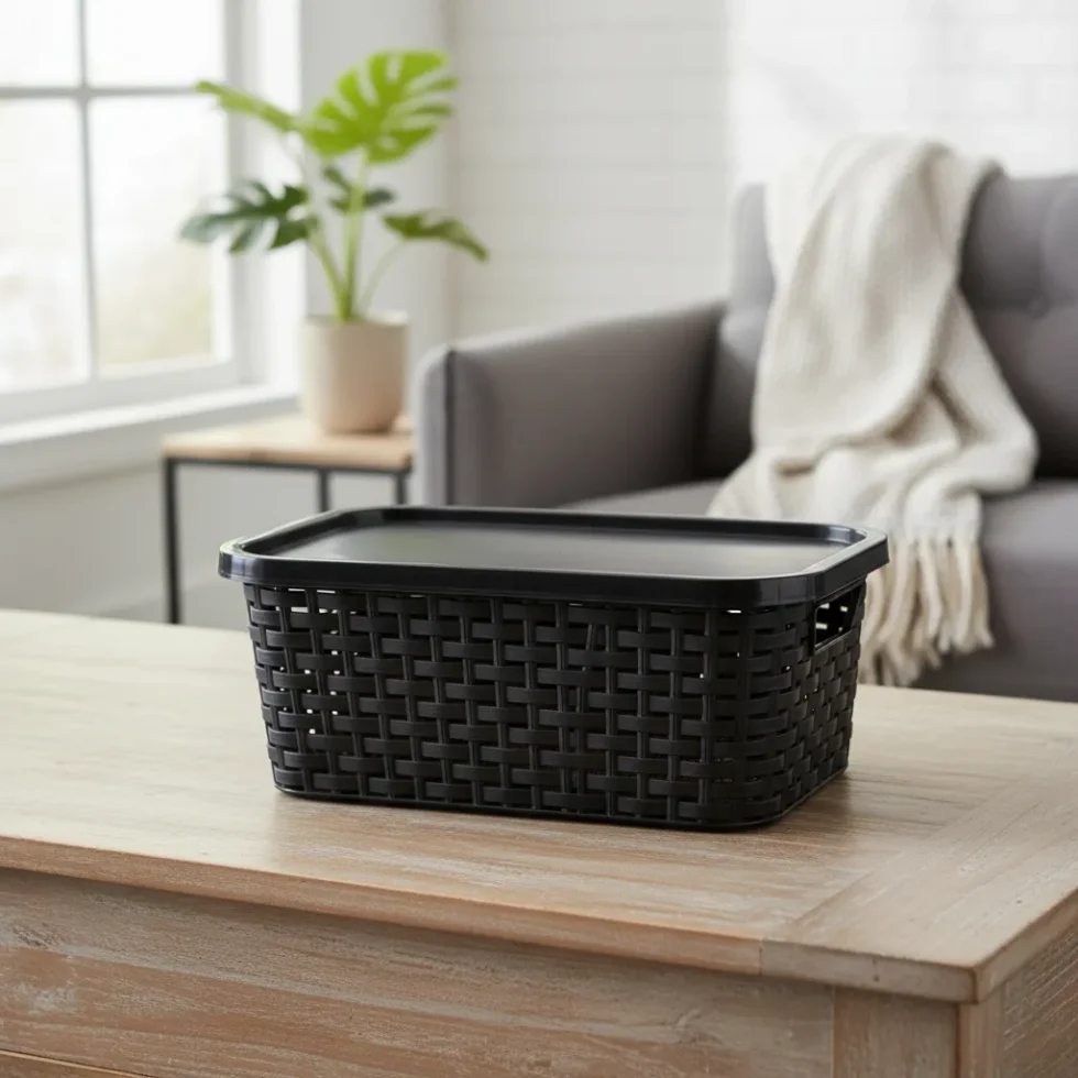 Su diseño funcional incluye una tapa ajustable que protege absolutamente todo del polvo. Pero su verdadera magia está en la optimización del espacio: su estructura firme te permite apilar una caja sobre la otra (con la tapa puesta), construyendo un sistema de guardado vertical que aprovecha cada centímetro.