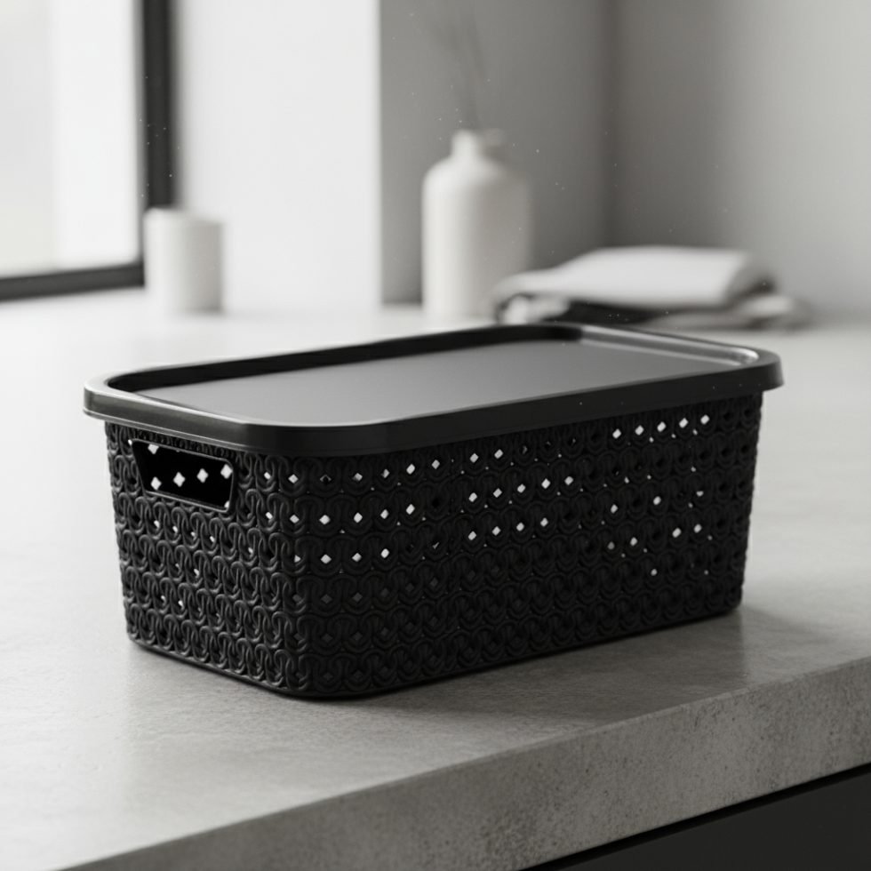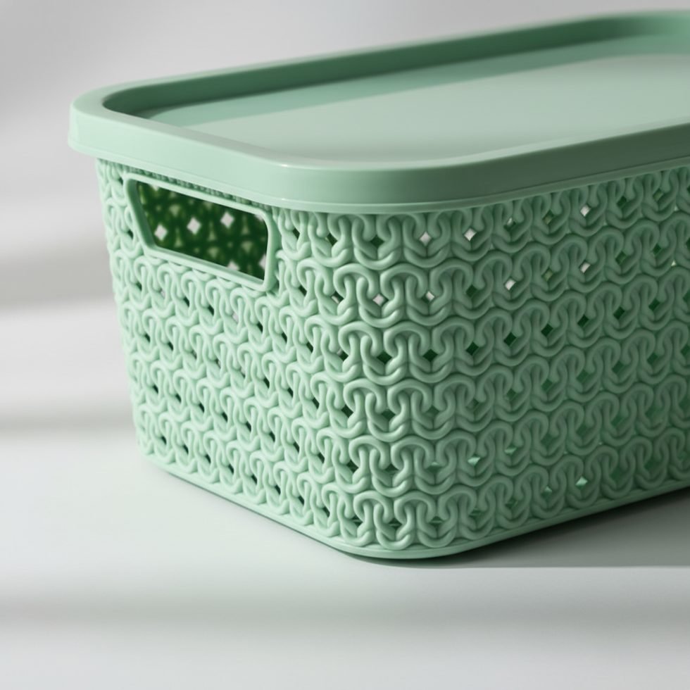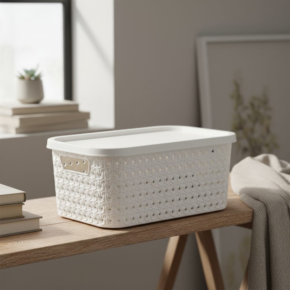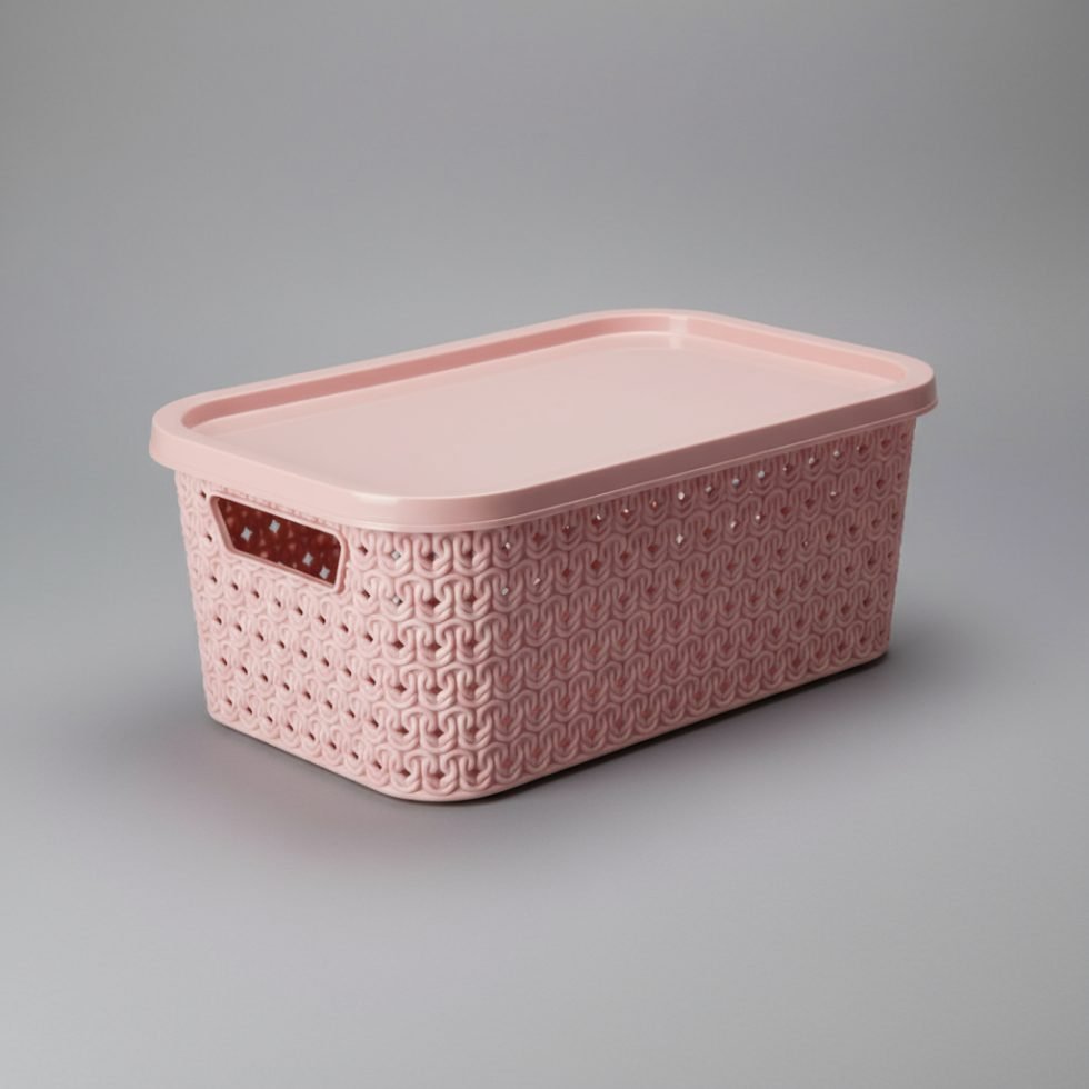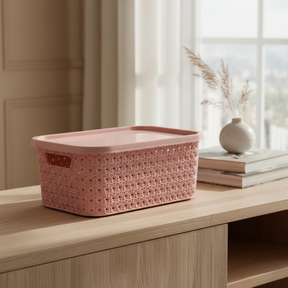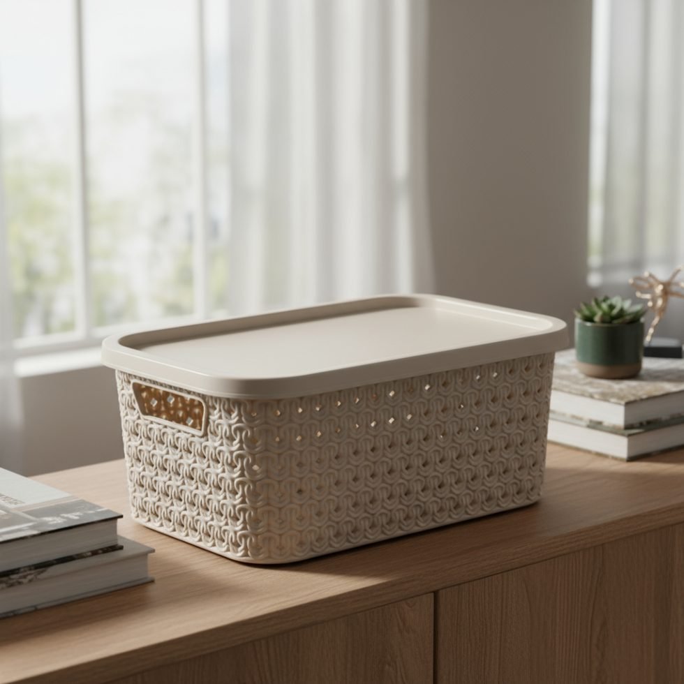 Está fabricada en plástico resistente de alta calidad. Su tapa ajustable protege todas tus pertenencias del polvo y garantiza que todo esté bien organizado y resguardado.