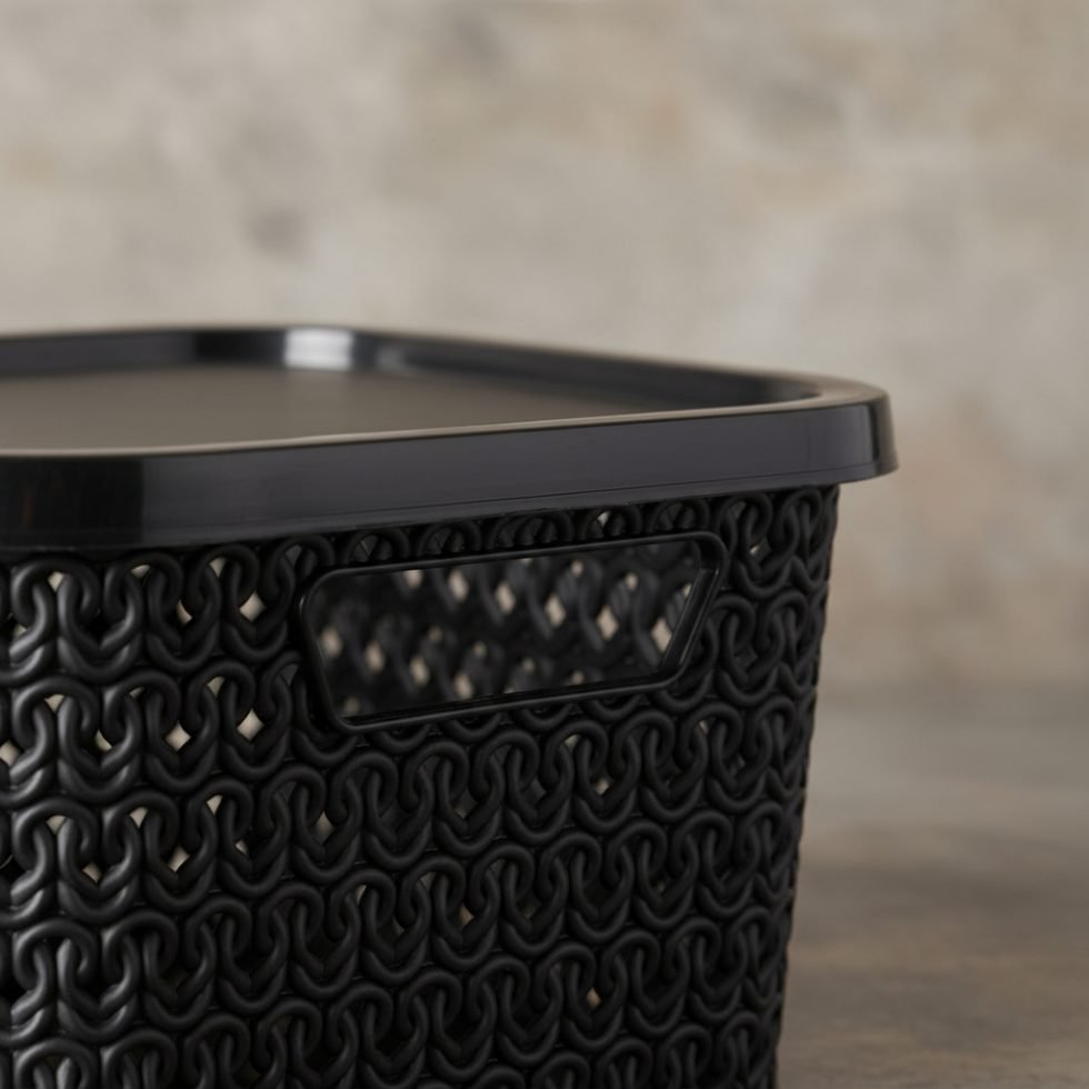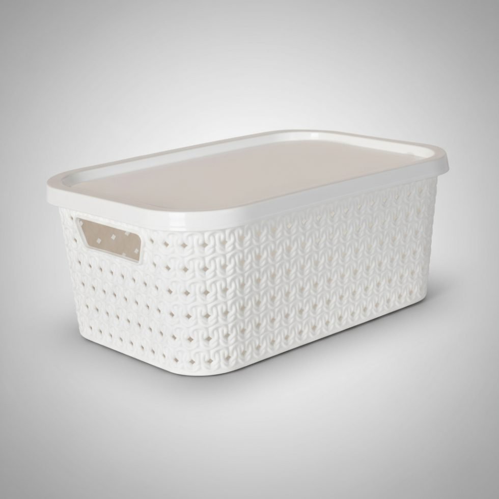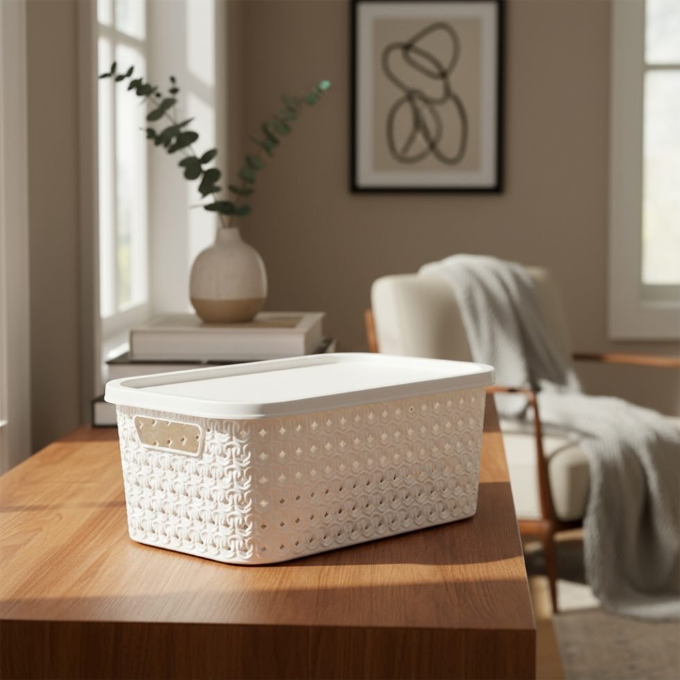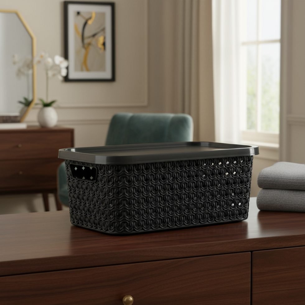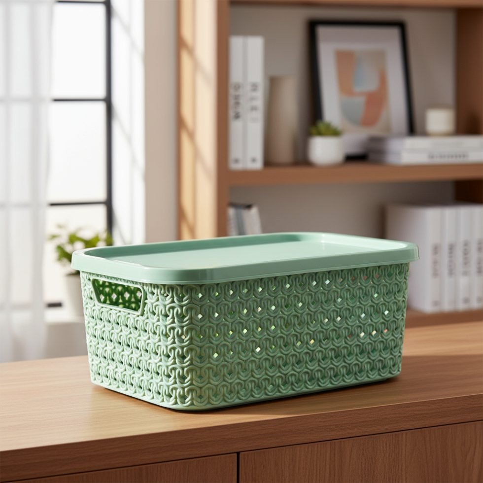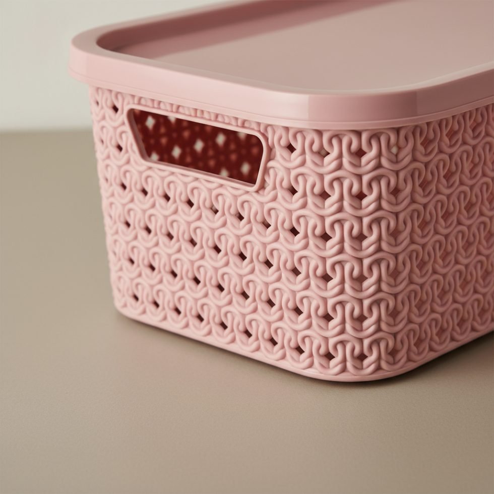 Está fabricada en plástico resistente de alta calidad. Su tapa ajustable protege todas tus pertenencias del polvo y garantiza que todo esté bien organizado y resguardado.